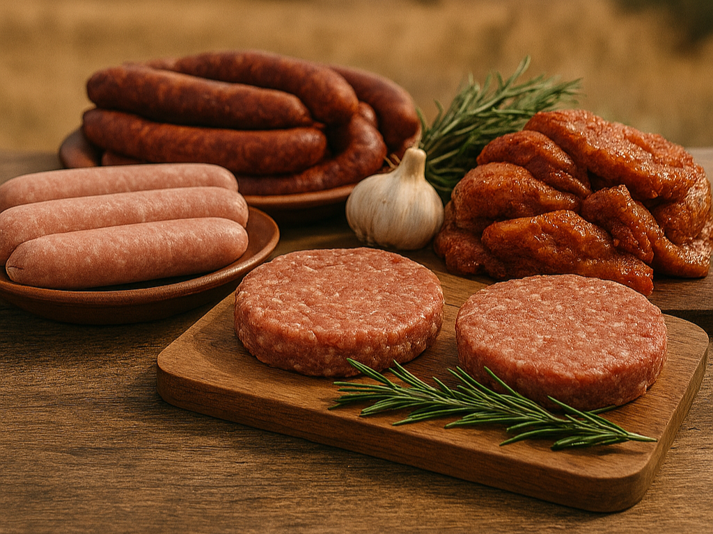 Hamburguesas caseras, salchichas, chorizos y adobos preparados en tienda.